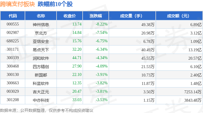 证券之星消息,4月28日跨境支付板块较上一交易日下跌1.95%,神州信息领跌。当日上证指数报收于4078.64,下跌0.19%。深证成指报收于14830.45,下跌1.1%。跨境支付板块个股涨跌见下表: