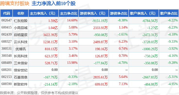从资金流向上来看,当日跨境支付板块主力资金净流出11.7亿元,游资资金净流入3.0亿元,散户资金净流入8.7亿元。跨境支付板块个股资金流向见下表: