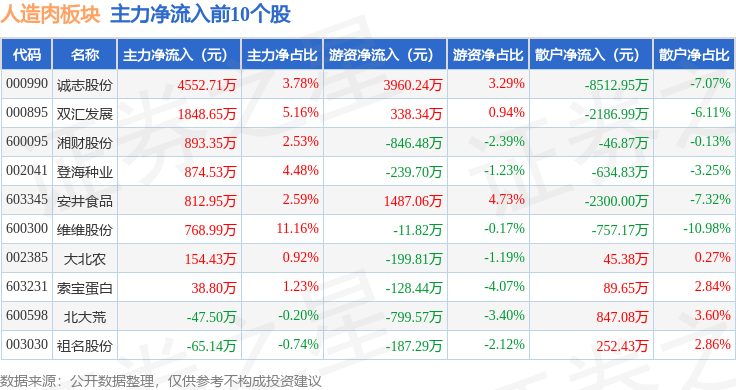 从资金流向上来看,当日人造肉板块主力资金净流出2.33亿元,游资资金净流入1.1亿元,散户资金净流入1.23亿元。人造肉板块个股资金流向见下表: