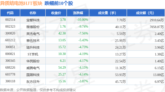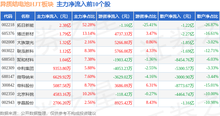 从资金流向上来看,当日异质结电池HJT板块主力资金净流出8.44亿元,游资资金净流入9449.16万元,散户资金净流入7.49亿元。异质结电池HJT板块个股资金流向见下表: