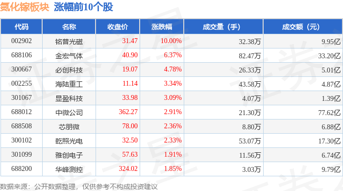 证券之星消息,4月28日氮化镓板块较上一交易日下跌1.84%,盛美上海领跌。当日上证指数报收于4078.64,下跌0.19%。深证成指报收于14830.45,下跌1.1%。氮化镓板块个股涨跌见下表: