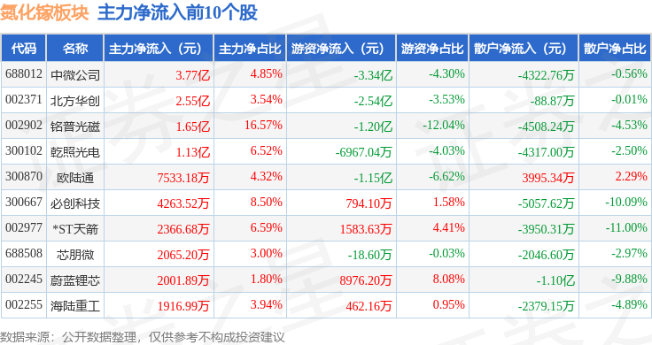 从资金流向上来看,当日氮化镓板块主力资金净流出60.8亿元,游资资金净流入9.21亿元,散户资金净流入51.59亿元。氮化镓板块个股资金流向见下表: