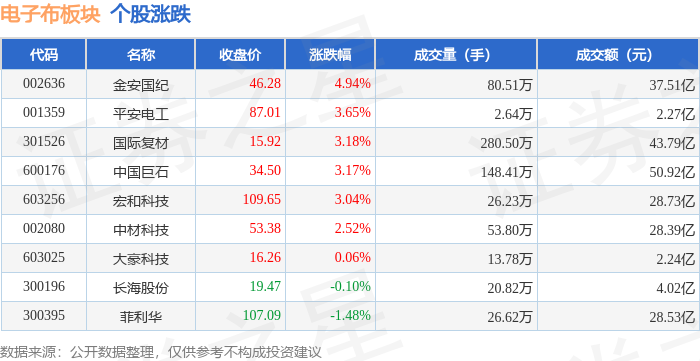 证券之星消息,4月28日电子布板块较上一交易日上涨2.41%,金安国纪领涨。当日上证指数报收于4078.64,下跌0.19%。深证成指报收于14830.45,下跌1.1%。电子布板块个股涨跌见下表: