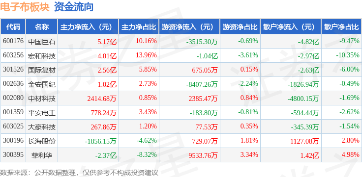 从资金流向上来看,当日电子布板块主力资金净流入10.55亿元,游资资金净流出9073.89万元,散户资金净流出9.65亿元。电子布板块个股资金流向见下表: