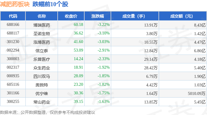 证券之星消息,4月28日减肥药板块较上一交易日下跌0.48%,博瑞医药领跌。当日上证指数报收于4078.64,下跌0.19%。深证成指报收于14830.45,下跌1.1%。减肥药板块个股涨跌见下表: