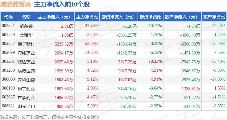 从资金流向上来看,当日减肥药板块主力资金净流出7309.89万元,游资资金净流出1.38亿元,散户资金净流入2.11亿元。减肥药板块个股资金流向见下表: