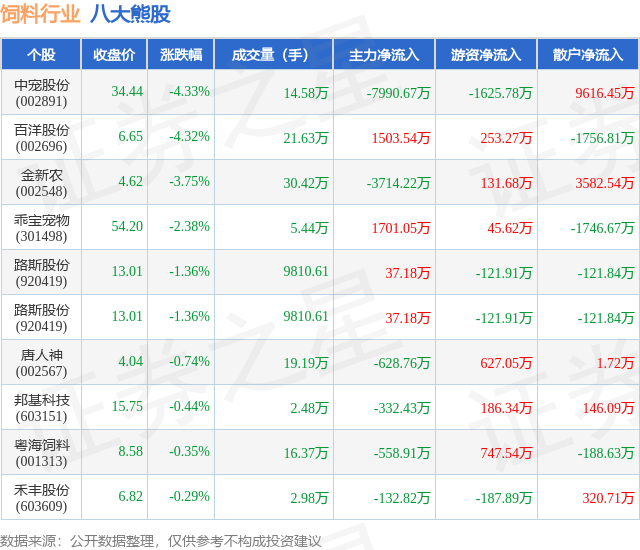 个股表现方面,饲料行业当日领跌股为中宠股份(002891),该股当日报收34.44,下跌4.33%,成交量14.58万,主力资金净流出7990.67万元。百洋股份(002696)以下跌4.32%紧随其后,该股当日成交量21.63万,主力资金净流入1503.54万元。除此之外,金新农(002548)、乖宝宠物(301498)、路斯股份(920419)均进入当日熊股之列。具体个股列表见下表: