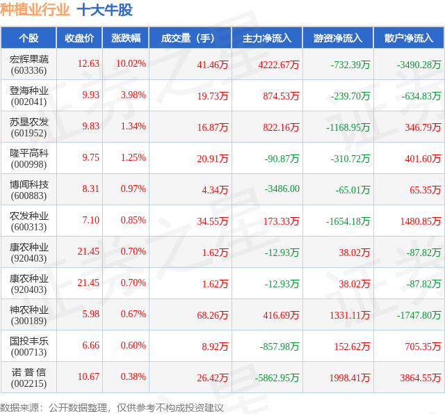 个股表现方面,种植业行业当日领涨股为宏辉果蔬(603336),该股当日报收12.63,上涨10.02%,成交量41.46万,主力资金净流入4222.67万元。登海种业(002041)以上涨3.98%紧随其后,该股当日成交量19.73万,主力资金净流入874.53万元。除此之外,苏垦农发(601952)、隆平高科(000998)、博闻科技(600883)均进入当日牛股之列。具体个股列表见下表: