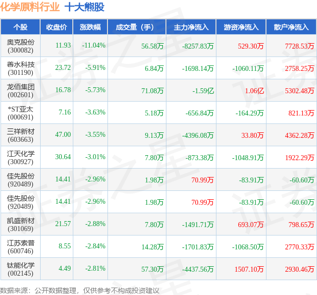 个股表现方面,化学原料行业当日领跌股为奥克股份(300082),该股当日报收11.93,下跌11.04%,成交量56.58万,主力资金净流出8257.83万元。善水科技(301190)以下跌5.91%紧随其后,该股当日成交量6.84万,主力资金净流出1698.14万元。除此之外,龙佰集团(002601)、*ST亚太(000691)、三祥新材(603663)均进入当日熊股之列。具体个股列表见下表: