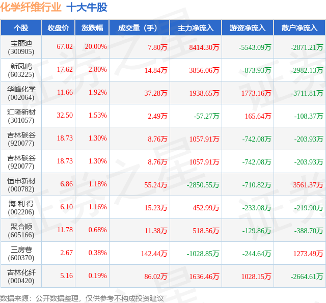 个股表现方面,化学纤维行业当日领涨股为宝丽迪(300905),该股当日报收67.02,上涨20.0%,成交量7.8万,主力资金净流入8414.3万元。新凤鸣(603225)以上涨2.8%紧随其后,该股当日成交量14.84万,主力资金净流入3856.06万元。除此之外,华峰化学(002064)、汇隆新材(301057)、吉林碳谷(920077)均进入当日牛股之列。具体个股列表见下表:
