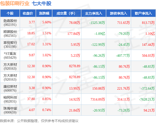 个股表现方面,包装印刷行业当日领涨股为劲嘉股份(002191),该股当日报收3.77,上涨5.6%,成交量78.08万,主力资金净流出1525.38万元。顺灏股份(002565)以上涨1.51%紧随其后,该股当日成交量177.84万,主力资金净流出1.09亿元。除此之外,喜悦智行(301198)、*ST集友(603429)、方大新材(920163)均进入当日牛股之列。具体个股列表见下表: