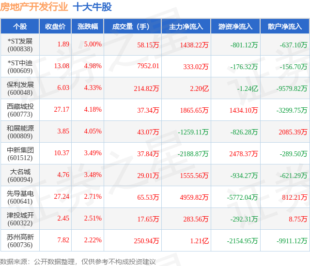 个股表现方面,房地产开发行业当日领涨股为*ST发展(000838),该股当日报收1.89,上涨5.0%,成交量58.15万,主力资金净流入1438.22万元。*ST中迪(000609)以上涨4.98%紧随其后,该股当日成交量7952.0,主力资金净流入333.02万元。除此之外,保利发展(600048)、西藏城投(600773)、和展能源(000809)均进入当日牛股之列。具体个股列表见下表: