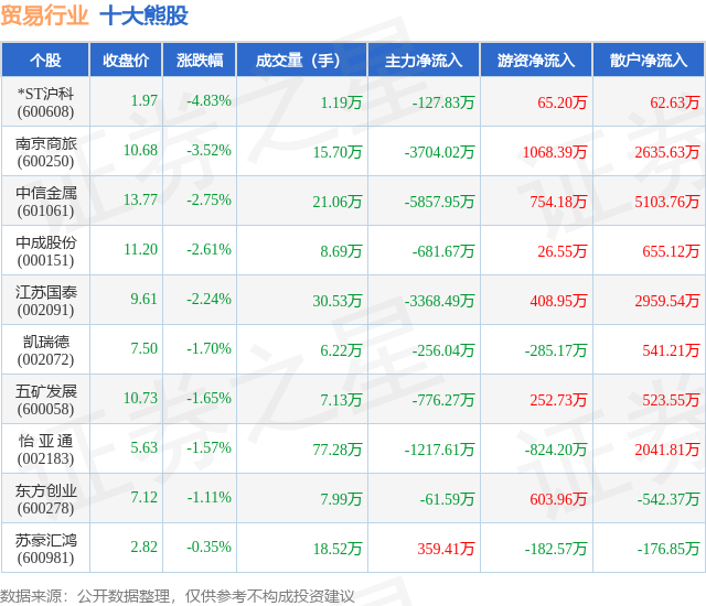 个股表现方面,贸易行业当日领跌股为*ST沪科(600608),该股当日报收1.97,下跌4.83%,成交量1.19万,主力资金净流出127.83万元。南京商旅(600250)以下跌3.52%紧随其后,该股当日成交量15.7万,主力资金净流出3704.02万元。除此之外,中信金属(601061)、中成股份(000151)、江苏国泰(002091)均进入当日熊股之列。具体个股列表见下表: