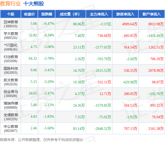 个股表现方面,教育行业当日领跌股为豆神教育(300010),该股当日报收5.06,下跌6.47%,成交量88.06万,主力资金净流出1.37亿元。学大教育(000526)以下跌6.34%紧随其后,该股当日成交量7.48万,主力资金净流入730.68万元。除此之外,*ST国化(600636)、行动教育(605098)、国脉科技(002093)均进入当日熊股之列。具体个股列表见下表: