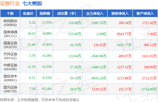 个股表现方面,证券行业当日领跌股为哈投股份(600864),该股当日报收6.22,下跌2.35%,成交量110.08万,主力资金净流出1995.76万元。国泰海通(601211)以下跌0.68%紧随其后,该股当日成交量151.6万,主力资金净流出2.0亿元。除此之外,国盛证券(002670)、天风证券(601162)、中银证券(601696)均进入当日熊股之列。具体个股列表见下表:
