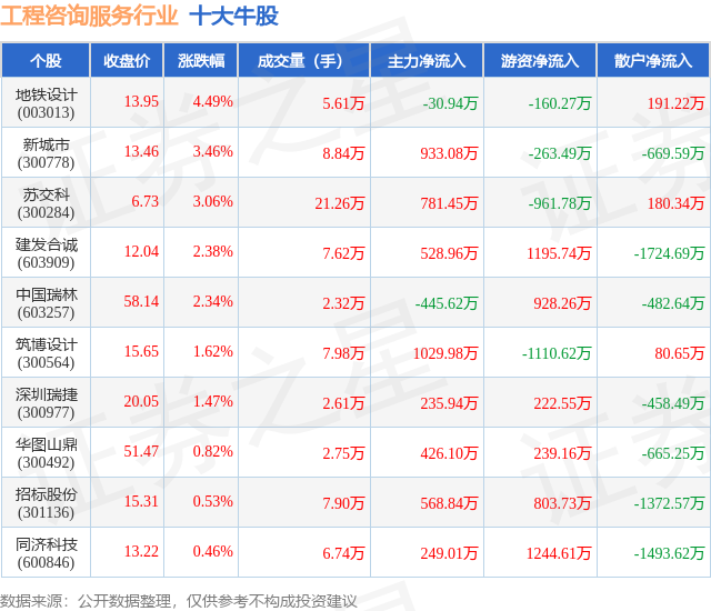 个股表现方面,工程咨询服务行业当日领涨股为地铁设计(003013),该股当日报收13.95,上涨4.49%,成交量5.61万,主力资金净流出30.94万元。新城市(300778)以上涨3.46%紧随其后,该股当日成交量8.84万,主力资金净流入933.08万元。除此之外,苏交科(300284)、建发合诚(603909)、中国瑞林(603257)均进入当日牛股之列。具体个股列表见下表: