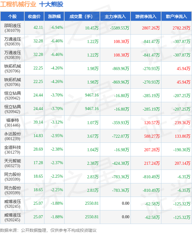 个股表现方面,工程机械行业当日领跌股为邵阳液压(301079),该股当日报收42.11,下跌6.94%,成交量10.45万,主力资金净流出5589.55万元。万通液压(920839)以下跌6.46%紧随其后,该股当日成交量1.22万,主力资金净流入108.38万元。除此之外,万通液压(920839)、铁拓机械(920706)、铁拓机械(920706)均进入当日熊股之列。具体个股列表见下表: