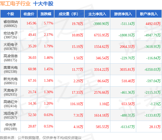 个股表现方面,军工电子行业当日领涨股为睿创微纳(688002),该股当日报收145.96,上涨5.77%,成交量19.78万,主力资金净流出3980.9万元。宏达电子(300726)以上涨2.17%紧随其后,该股当日成交量10.89万,主力资金净流入6755.95万元。除此之外,火炬电子(603678)、高凌信息(688175)、奥普光电(002338)均进入当日牛股之列。具体个股列表见下表:
