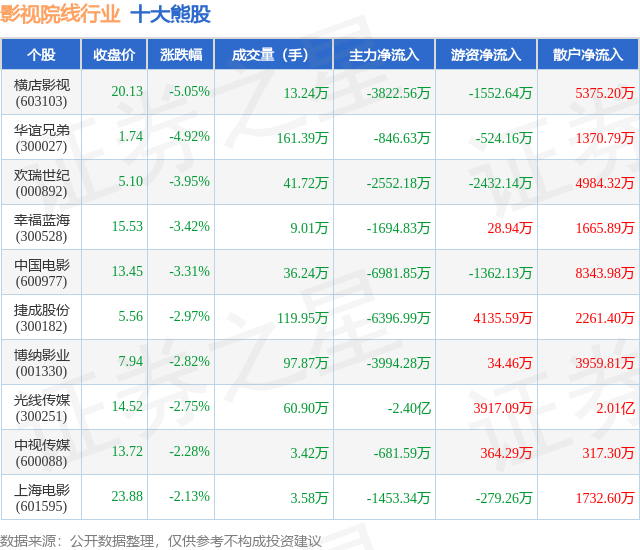 个股表现方面,影视院线行业当日领跌股为横店影视(603103),该股当日报收20.13,下跌5.05%,成交量13.24万,主力资金净流出3822.56万元。华谊兄弟(300027)以下跌4.92%紧随其后,该股当日成交量161.39万,主力资金净流出846.63万元。除此之外,欢瑞世纪(000892)、幸福蓝海(300528)、中国电影(600977)均进入当日熊股之列。具体个股列表见下表: