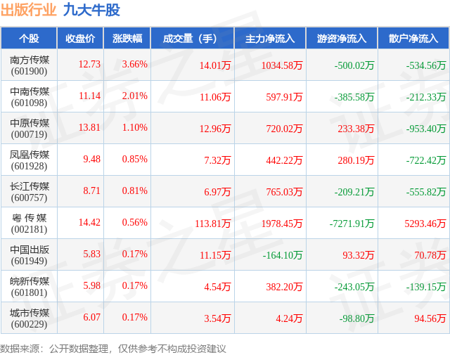 个股表现方面,出版行业当日领涨股为南方传媒(601900),该股当日报收12.73,上涨3.66%,成交量14.01万,主力资金净流入1034.58万元。中南传媒(601098)以上涨2.01%紧随其后,该股当日成交量11.06万,主力资金净流入597.91万元。除此之外,中原传媒(000719)、凤凰传媒(601928)、长江传媒(600757)均进入当日牛股之列。具体个股列表见下表: