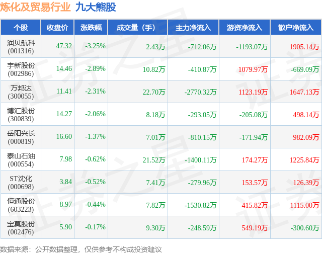 个股表现方面,炼化及贸易行业当日领跌股为润贝航科(001316),该股当日报收47.32,下跌3.25%,成交量2.43万,主力资金净流出712.06万元。宇新股份(002986)以下跌2.89%紧随其后,该股当日成交量10.82万,主力资金净流出410.87万元。除此之外,万邦达(300055)、博汇股份(300839)、岳阳兴长(000819)均进入当日熊股之列。具体个股列表见下表: