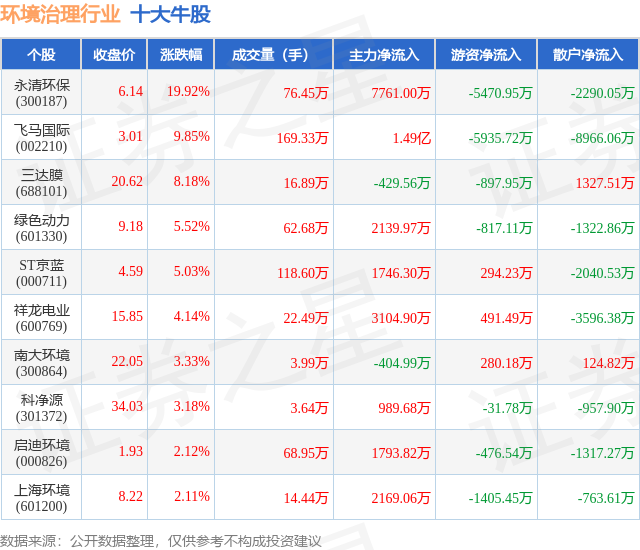 个股表现方面,环境治理行业当日领涨股为永清环保(300187),该股当日报收6.14,上涨19.92%,成交量76.45万,主力资金净流入7761.0万元。飞马国际(002210)以上涨9.85%紧随其后,该股当日成交量169.33万,主力资金净流入1.49亿元。除此之外,三达膜(688101)、绿色动力(601330)、ST京蓝(000711)均进入当日牛股之列。具体个股列表见下表: