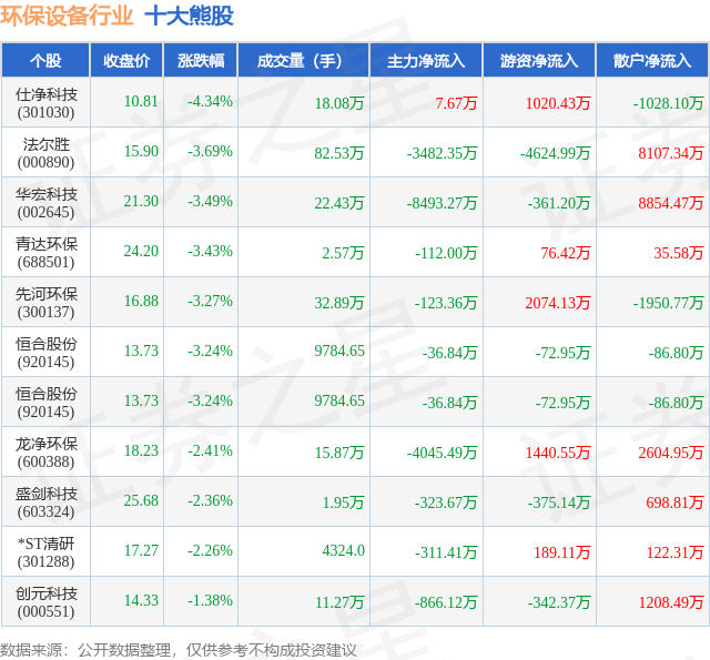 个股表现方面,环保设备行业当日领跌股为仕净科技(301030),该股当日报收10.81,下跌4.34%,成交量18.08万,主力资金净流入7.67万元。法尔胜(000890)以下跌3.69%紧随其后,该股当日成交量82.53万,主力资金净流出3482.35万元。除此之外,华宏科技(002645)、青达环保(688501)、先河环保(300137)均进入当日熊股之列。具体个股列表见下表: