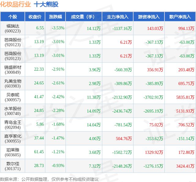 个股表现方面,化妆品行业当日领跌股为福瑞达(600223),该股当日报收6.55,下跌3.53%,成交量14.12万,主力资金净流出1137.16万元。芭薇股份(920123)以下跌3.01%紧随其后,该股当日成交量1.33万,主力资金净流入6.21万元。除此之外,芭薇股份(920123)、锦盛新材(300849)、丸美生物(603983)均进入当日熊股之列。具体个股列表见下表: