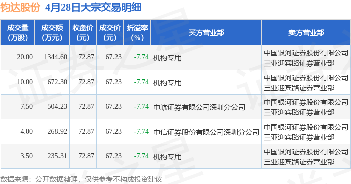 证券之星消息,4月28日钧达股份发生大宗交易,交易数据如下: