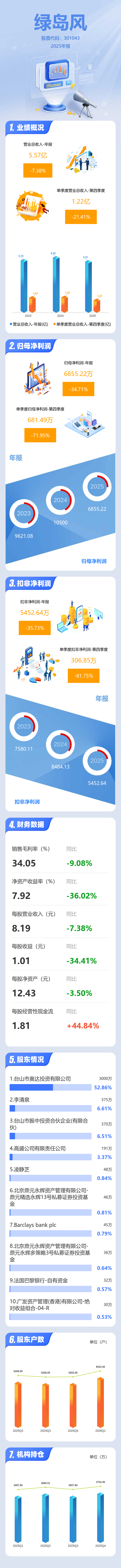 证券之星消息,绿岛风2025年年报显示,当年度公司主营收入5.57亿元,同比下降7.38%;归母净利润6855.22万元,同比下降34.71%;扣非净利润5452.64万元,同比下降35.73%;其中2025年第四季度,公司单季度主营收入1.22亿元,同比下降21.41%;单季度归母净利润681.49万元,同比下降71.96%;单季度扣非净利润306.85万元,同比下降81.76%;负债率31.71%,投资收益1769.02万元,财务费用553.49万元,毛利率34.05%。