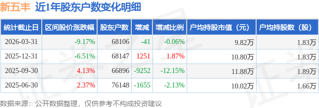 证券之星消息,近日新五丰披露,截至2026年3月31日公司股东户数为6.81万户,较12月31日减少41.0户,减幅为0.06%。户均持股数量由上期的1.83万股增加至1.83万股,户均持股市值为9.82万元。