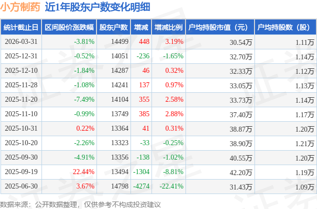证券之星消息,近日小方制药披露,截至2026年3月31日公司股东户数为1.45万户,较12月31日增加448.0户,增幅为3.19%。户均持股数量由上期的1.14万股减少至1.11万股,户均持股市值为30.54万元。