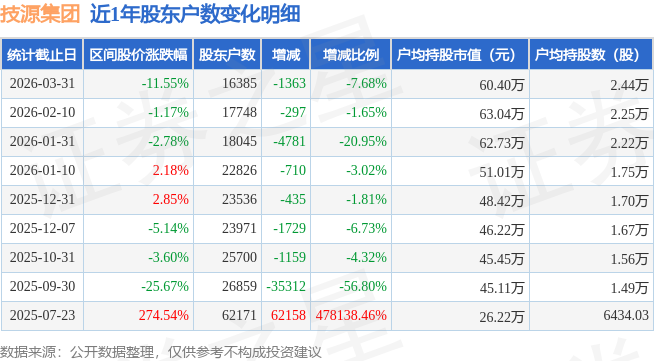 从股价来看,2026年2月10日至2026年3月31日,技源集团区间跌幅为11.55%,在此期间股东户数减少1363.0户,减幅为7.68%。