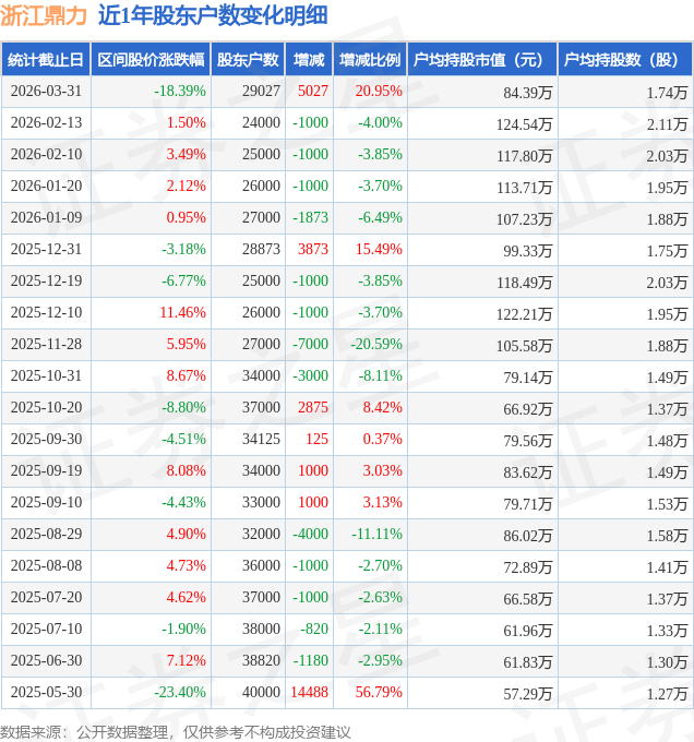 从股价来看,2026年2月27日至2026年3月31日,浙江鼎力区间跌幅为18.39%,在此期间股东户数增加5027.0户,增幅为20.95%。