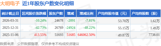 从股价来看,2025年12月31日至2026年3月31日,大明电子区间跌幅为10.24%,在此期间股东户数减少2091.0户,减幅为7.81%。