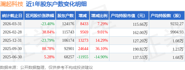 证券之星消息,近日澜起科技披露,截至2026年3月31日公司股东户数为12.42万户,较2月28日增加8433.0户,增幅为7.29%。户均持股数量由上期的9905.0股减少至9232.0股,户均持股市值为115.66万元。