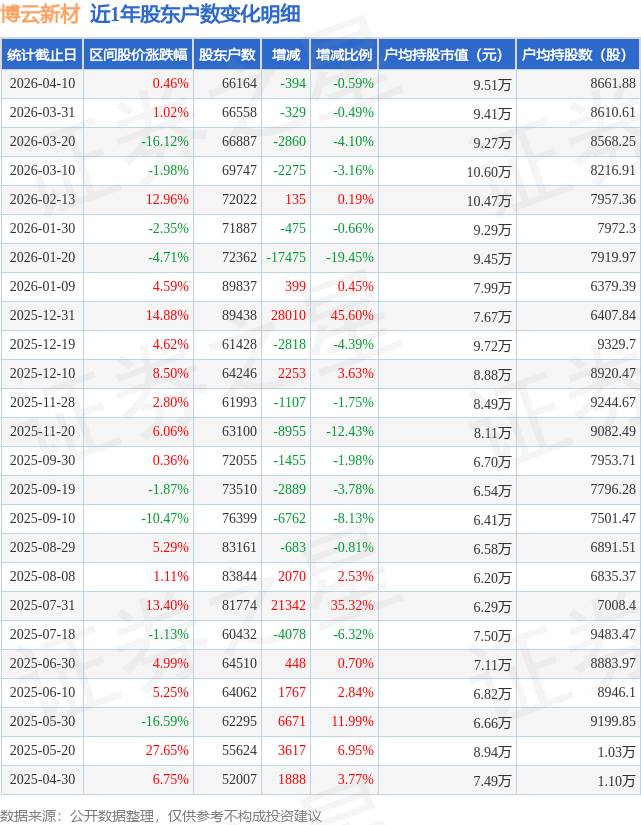 证券之星消息,近日博云新材披露,截至2026年4月10日公司股东户数为6.62万户,较3月31日减少394.0户,减幅为0.59%。户均持股数量由上期的8611.0股增加至8662.0股,户均持股市值为9.51万元。