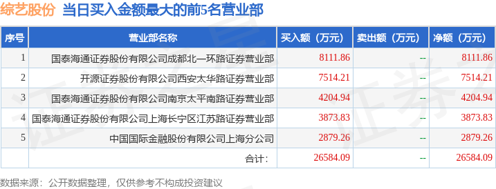 证券之星消息,沪深交易所2026年4月28日公布的交易公开信息显示,综艺股份(600770)因有价格涨跌幅限制的日价格振幅达到15%的前五只证券,有价格涨跌幅限制的日收盘价格涨幅偏离值达到7%的前五只证券登上龙虎榜。此次是近5个交易日内第3次上榜。