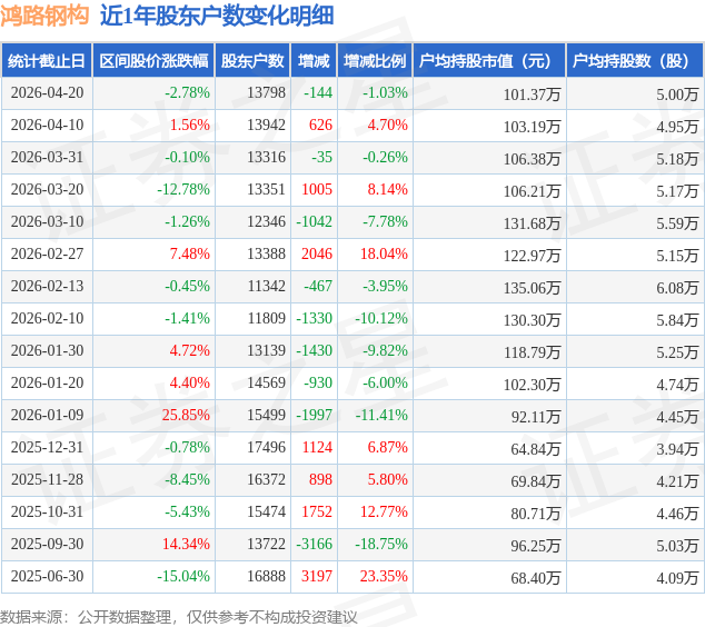 证券之星消息,近日鸿路钢构披露,截至2026年4月20日公司股东户数为1.38万户,较4月10日减少144.0户,减幅为1.03%。户均持股数量由上期的4.95万股增加至5.0万股,户均持股市值为101.37万元。