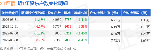从股价来看,2025年12月31日至2026年3月31日,ST恒信区间跌幅为11.18%,在此期间股东户数减少5787.0户,减幅为11.41%。