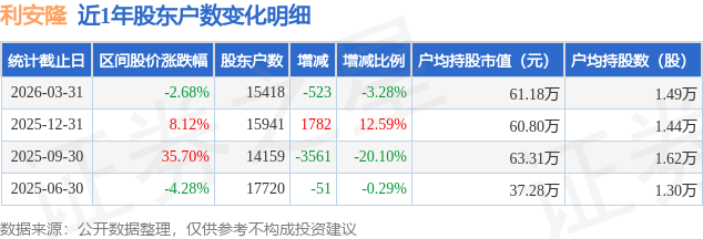 证券之星消息,近日利安隆披露,截至2026年3月31日公司股东户数为1.54万户,较12月31日减少523.0户,减幅为3.28%。户均持股数量由上期的1.44万股增加至1.49万股,户均持股市值为61.18万元。