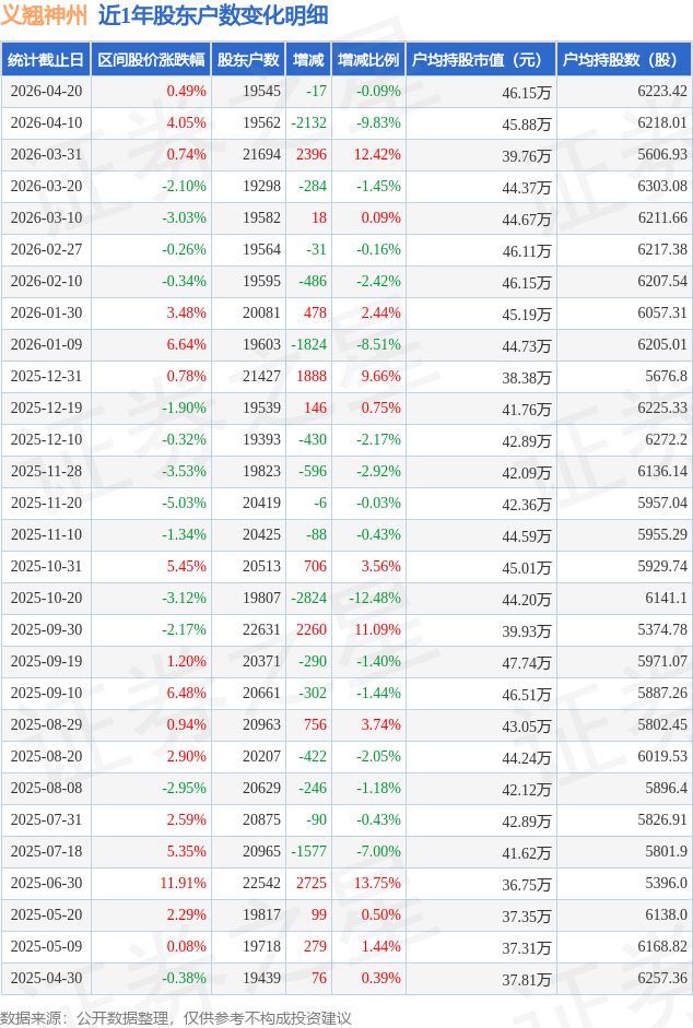证券之星消息,近日义翘神州披露,截至2026年4月20日公司股东户数为1.95万户,较4月10日减少17.0户,减幅为0.09%。户均持股数量由上期的6218.0股增加至6223.0股,户均持股市值为46.15万元。