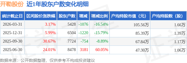 证券之星消息,近日开勒股份披露,截至2026年3月31日公司股东户数为5428.0户,较12月31日减少1076.0户,减幅为16.54%。户均持股数量由上期的1.39万股增加至1.66万股,户均持股市值为105.56万元。