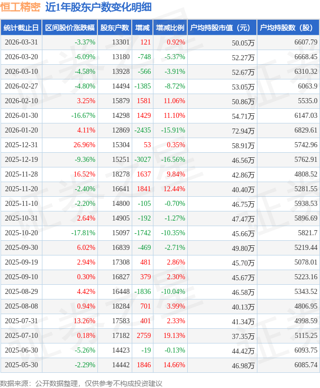 从股价来看,2026年3月20日至2026年3月31日,恒工精密区间跌幅为3.37%,在此期间股东户数增加121.0户,增幅为0.92%。