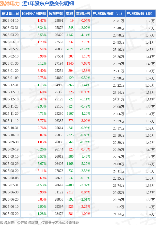 从股价来看,2026年3月31日至2026年4月10日,泓淋电力区间涨幅为1.47%,在此期间股东户数增加19.0户,增幅为0.07%。