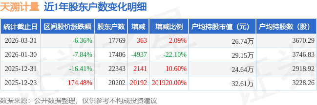 从股价来看,2026年1月30日至2026年3月31日,天溯计量区间跌幅为6.36%,在此期间股东户数增加363.0户,增幅为2.09%。