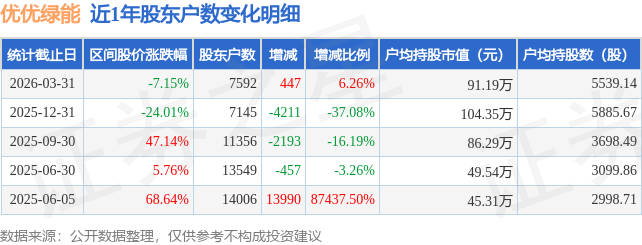 从股价来看,2025年12月31日至2026年3月31日,优优绿能区间跌幅为7.15%,在此期间股东户数增加447.0户,增幅为6.26%。