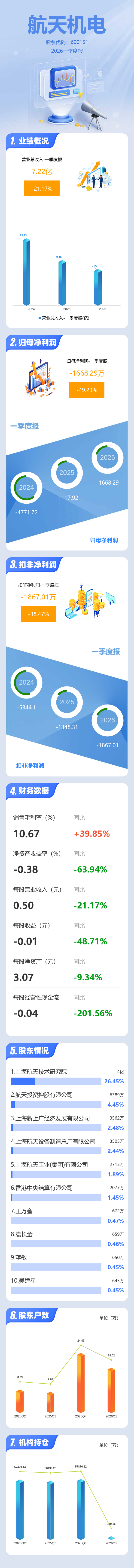 证券之星消息,航天机电2026年一季报显示,一季度公司主营收入7.22亿元,同比下降21.17%;归母净利润-1668.29万元,同比下降49.23%;扣非净利润-1867.01万元,同比下降38.47%;负债率31.1%,投资收益310.02万元,财务费用361.54万元,毛利率10.67%。