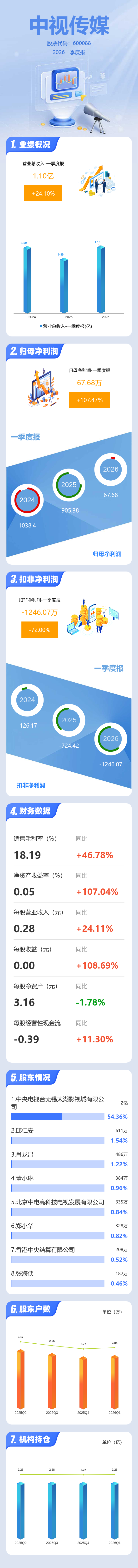 证券之星消息,中视传媒2026年一季报显示,一季度公司主营收入1.1亿元,同比上升24.11%;归母净利润67.68万元,同比上升107.48%;扣非净利润-1246.07万元,同比下降72.01%;负债率17.91%,投资收益2011.73万元,财务费用123.49万元,毛利率18.19%。