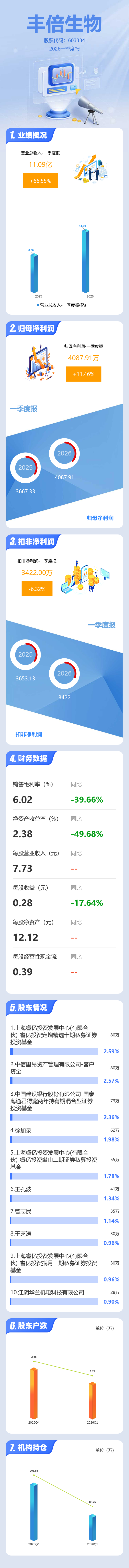 证券之星消息,丰倍生物2026年一季报显示,一季度公司主营收入11.09亿元,同比上升66.55%;归母净利润4087.91万元,同比上升11.47%;扣非净利润3422.0万元,同比下降6.33%;负债率19.63%,投资收益44.57万元,财务费用369.73万元,毛利率6.02%。